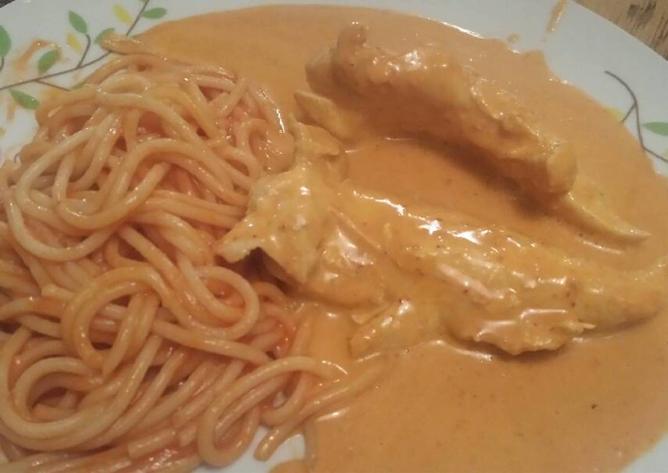 - En un sartén se calienta una cucharada de mantequilla cuando se derrita agrega la mezcla y enseguida el pollo deja hervir a fuego muy lento y listo acompaña con espagueti.