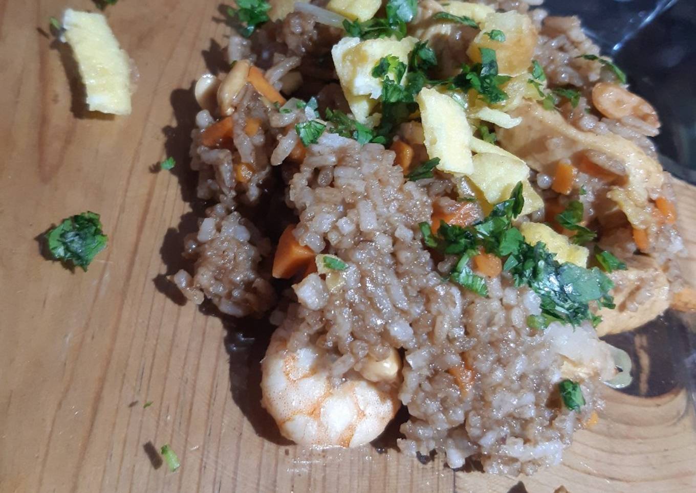 - En un wok cocina el pollo y el camarón con aceite de cacahuate. Antes de que se complete agrega la zanahoria cortada en jardinera. Posteriormente, agrega la cebolla en rodajas y el cacahuate. Estos deben tomar un color ligeramente dorado. Posteriormente, agrega el arroz ya cocido y la salsa de soya. Mezcla suavemente hasta tener homogéneo el color del arroz