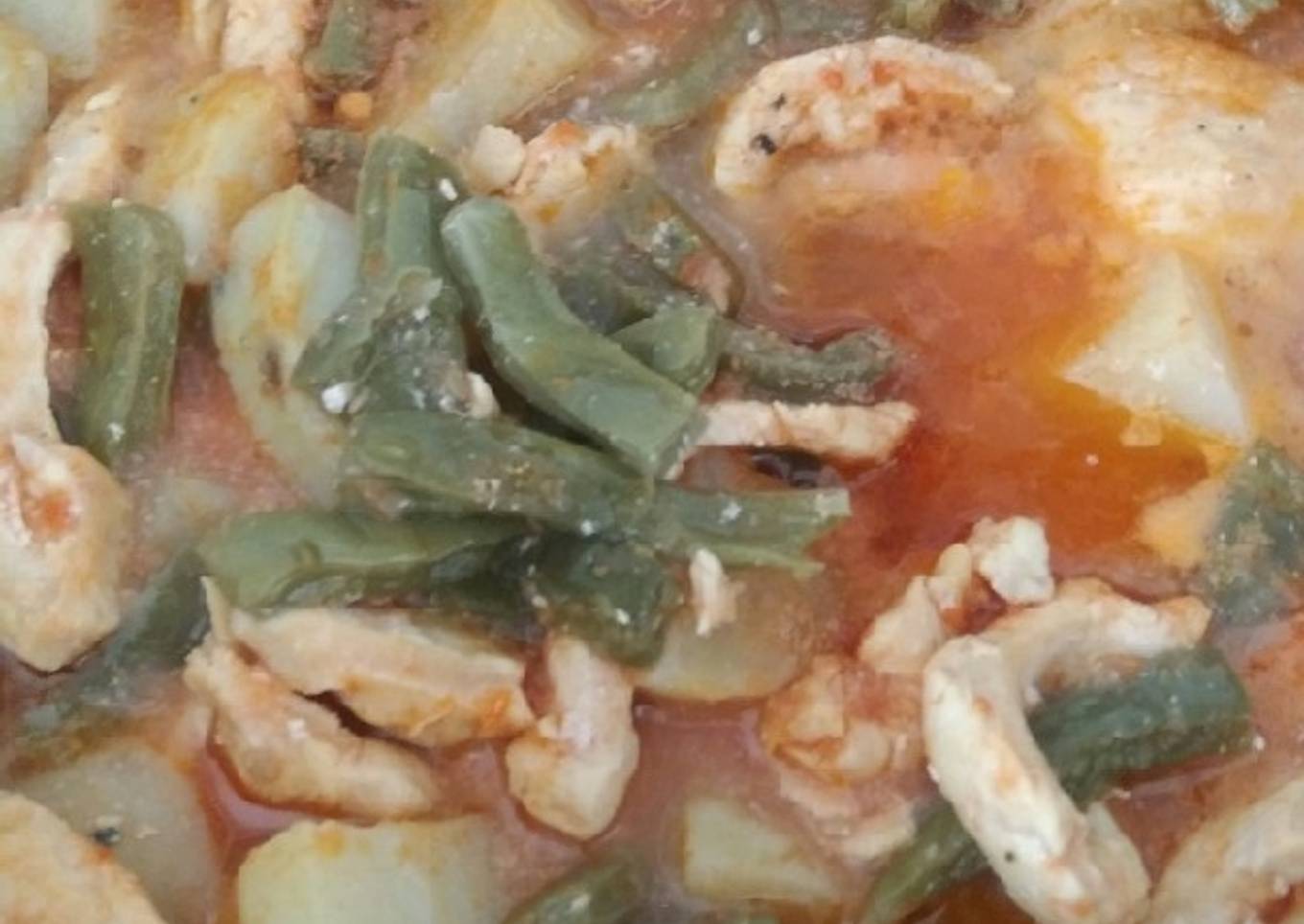 - Cuando el pollo está cocido agrega cebolla fileteada, espera 3 minutos y agrega papas y nopales