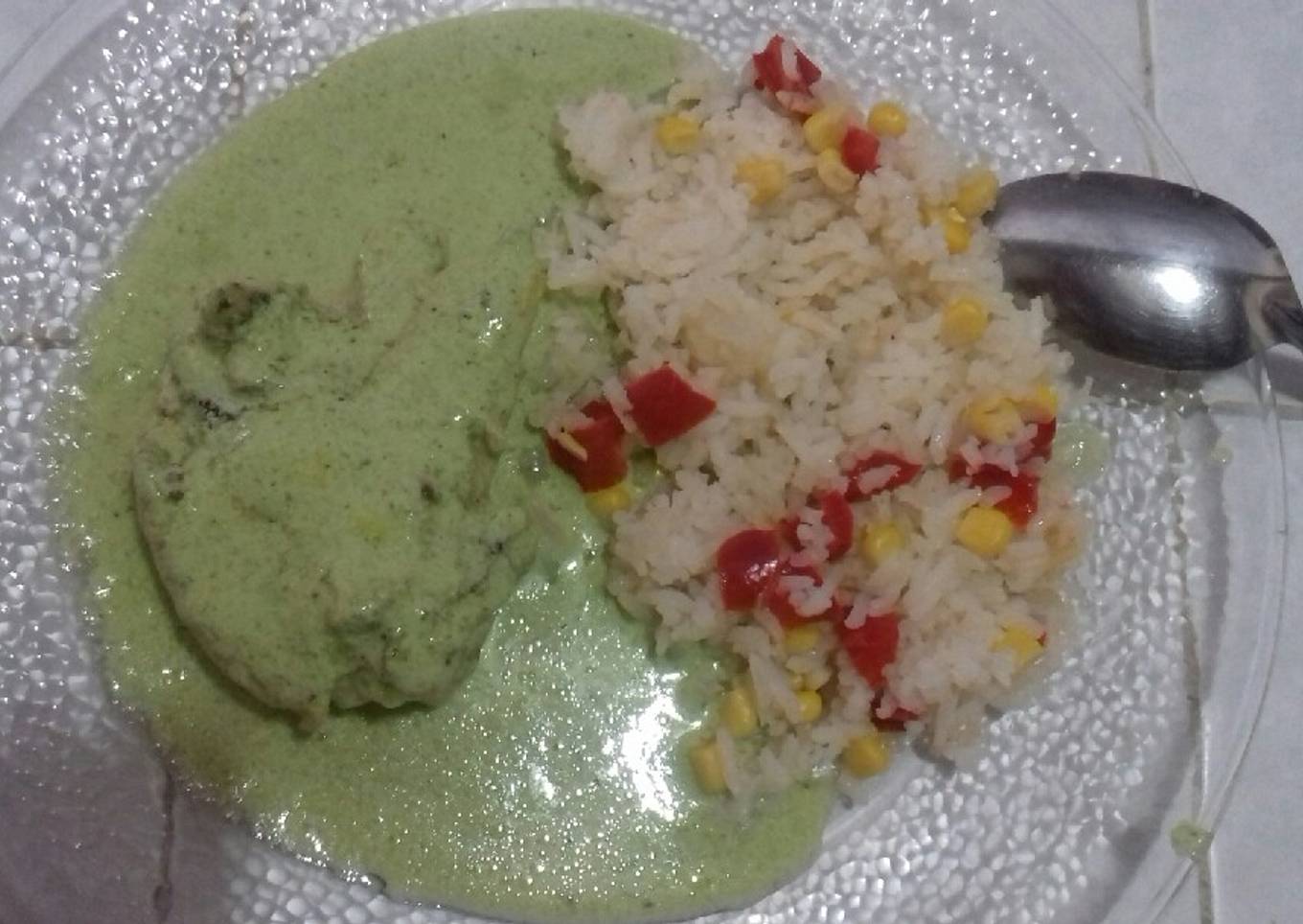 Riquísimo! Lo acompañé con arroz blanco mezclado con elote y cuadritos de pimiento rojo, para darle color y armonía a los sabores.